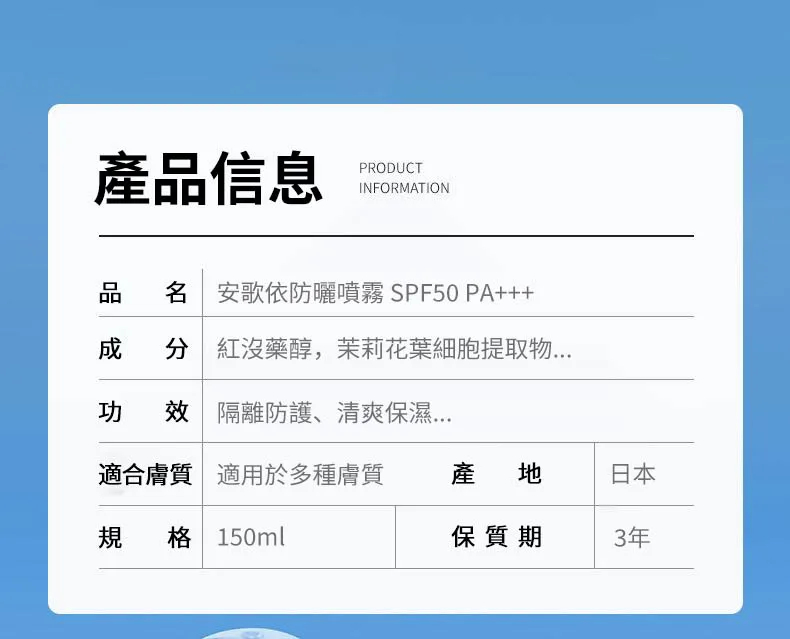 5分鐘前安歌依光圈防曬噴霧,細密噴頭設計 噴頭360°可旋轉自然膚惑,隔離防曬一瓶搞定 - 僅此一天「安歌依光圈防曬噴霧」8入72%用戶的選擇!NT$1598【限時免運】